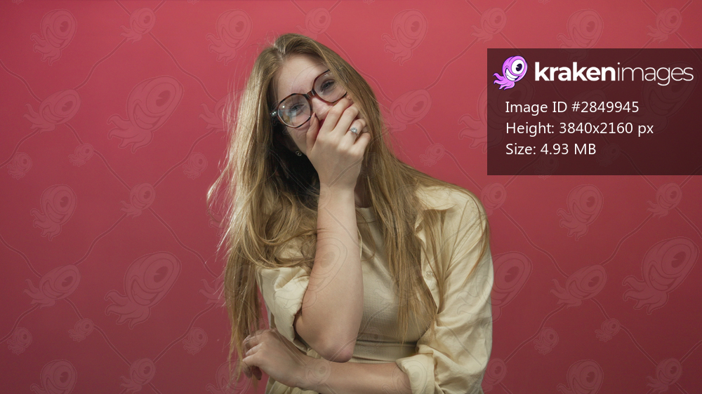 Young blonde woman with long hair and glasses covers mouth with hand while tilting head in studio; amusement.