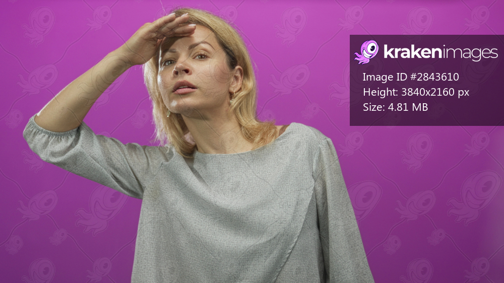 Young blonde woman looks into distance shading eyes with hand to forehead in pink studio; anticipation.