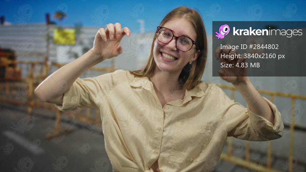 Young blonde woman makes claw gesture with hands at sunlit gritty construction building; playful mischief.