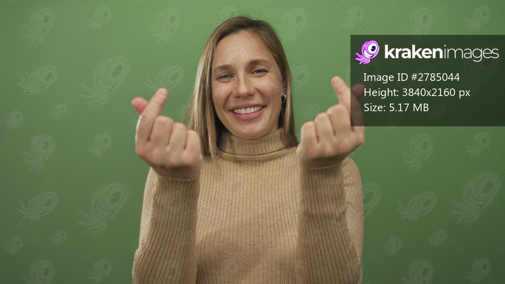 Young blonde woman makes finger heart with both hands on green studio wall; love affection warmth connection.