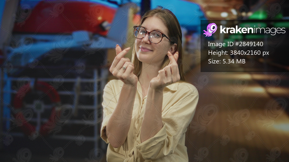 Young blonde woman makes finger heart gesture beside building facade under green lights at sunset; love.