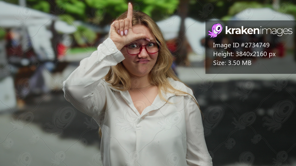 Young blonde woman makes loser gesture and points at camera in an outdoor market setting, capturing a playful moment on a sunny city street.