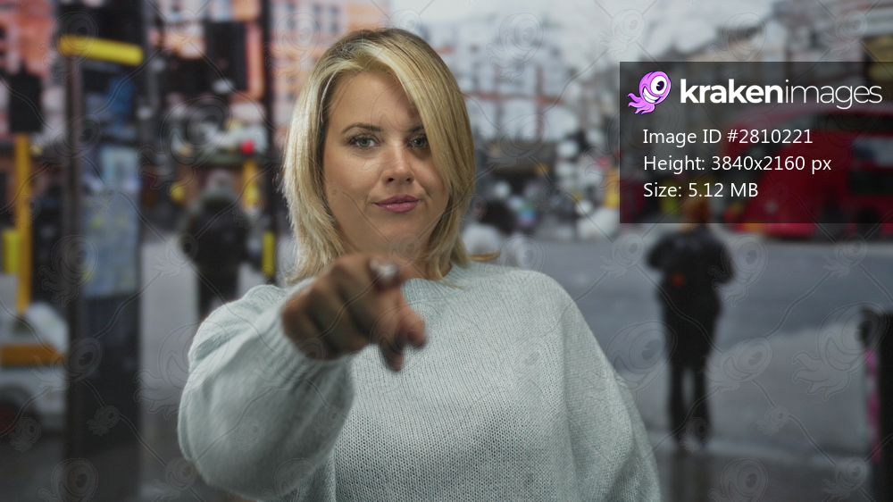 Young blonde woman makes throat cut gesture on busy city street near red bus and traffic lights; threat alarm caution.