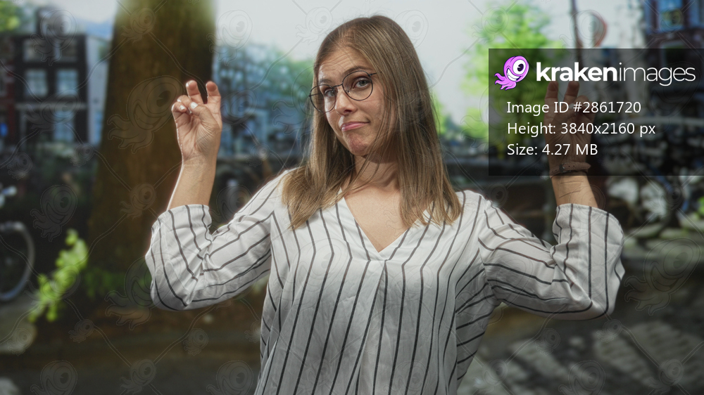 Young blonde woman making air quotes with both hands on a street canal in daylight, wearing striped top and round glasses; playful irony.