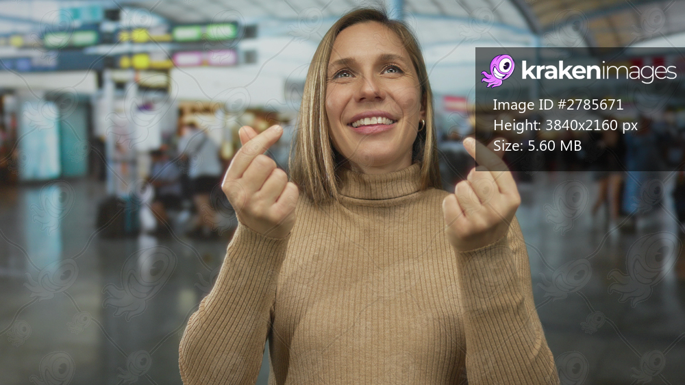 Young blonde woman making finger heart gesture in airport terminal; affection joy.