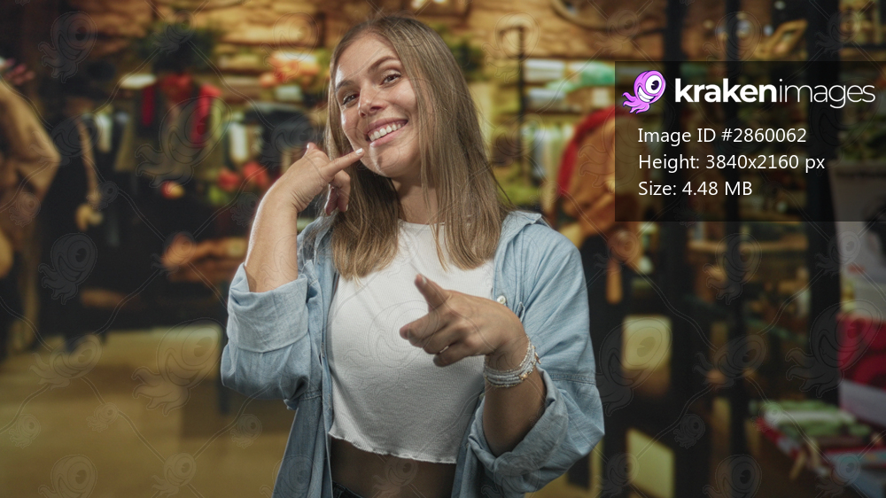 Young blonde woman making phone gesture with hand and pointing finger inside clothing shop building, smiling direct at camera; friendly casual confidence. - Kraken Images
