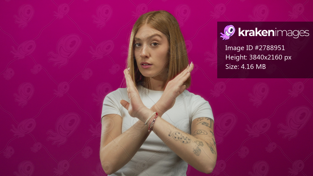 Young blonde woman making stop gesture with crossed arms against vibrant pink background