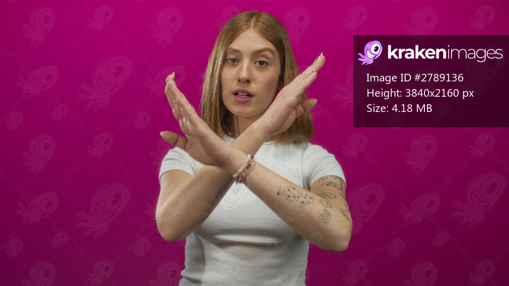 Young blonde woman making stop gesture with crossed arms against vibrant pink background