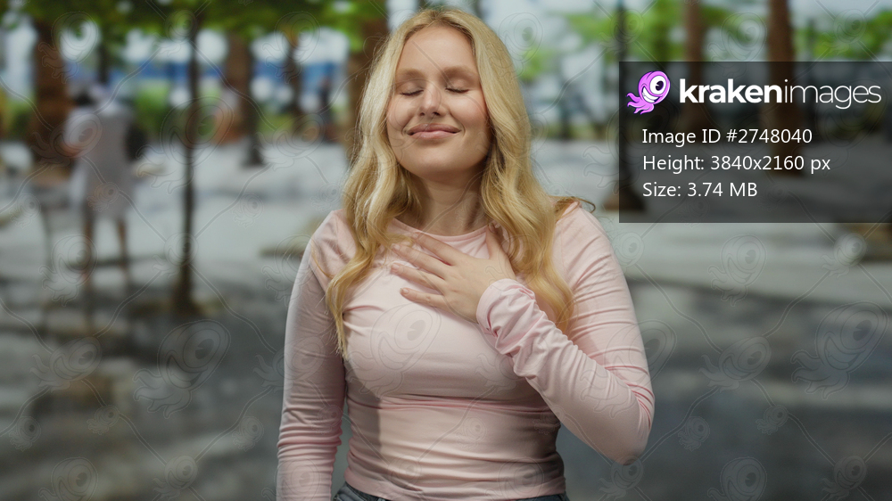 Young blonde woman on a city street outdoors expressing gratitude with hand on chest under green trees creating a serene urban atmosphere of happiness and appreciation - Kraken Images