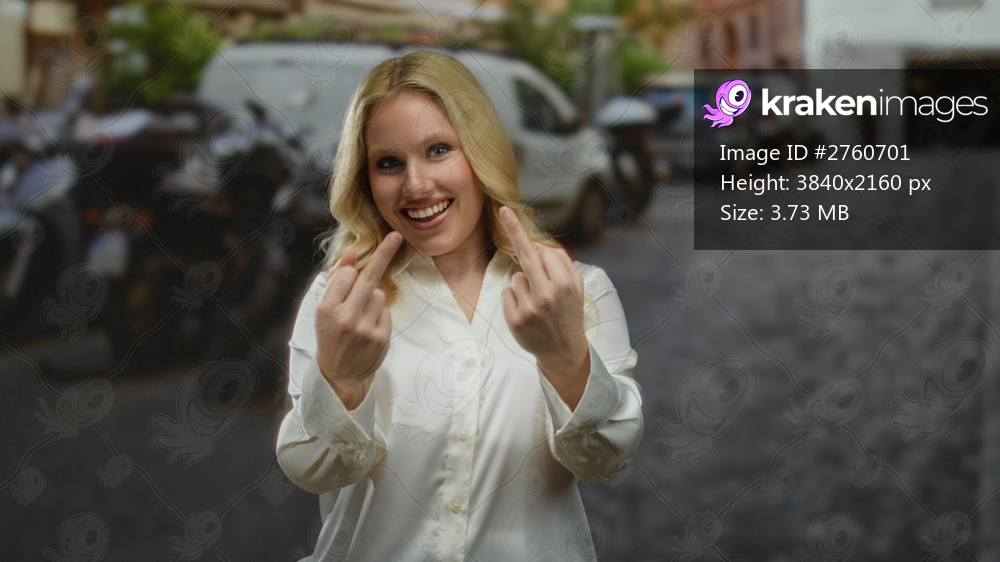 Young blonde woman outdoors in a city street smiling and displaying playful gestures with two fingers in a lively urban setting surrounded by parked vehicles. - Kraken Images