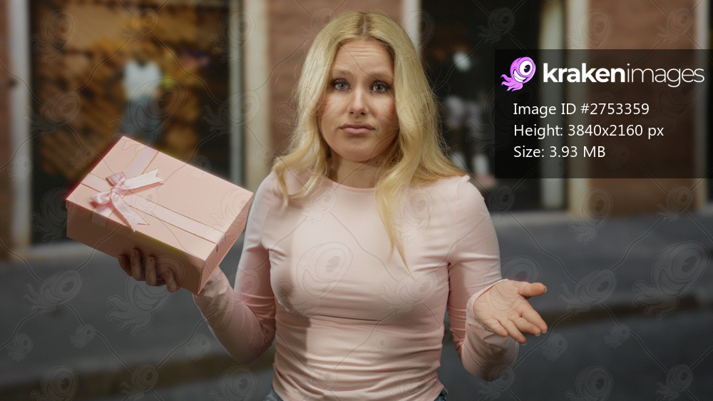 Young blonde woman outdoors in city holding present with displeased expression on street background suggesting disappointment at receiving an unwanted gift - Kraken Images