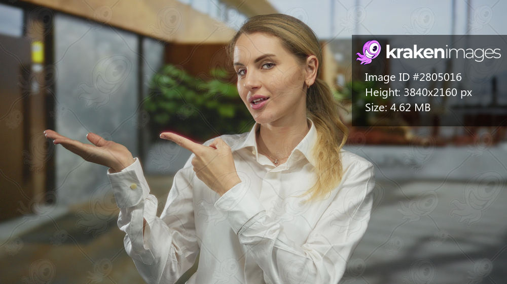 Young blonde woman outdoors pointing at her palm wearing white shirt in a casual setting with greenery background making gesture emphasizing something important in a relaxed manner. - Kraken Images