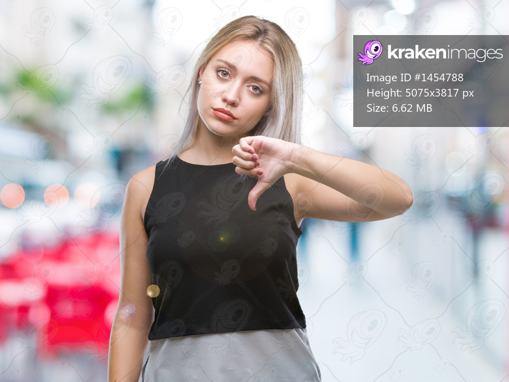 Young blonde woman over isolated background looking unhappy and angry showing rejection and negative with thumbs down gesture. Bad expression.