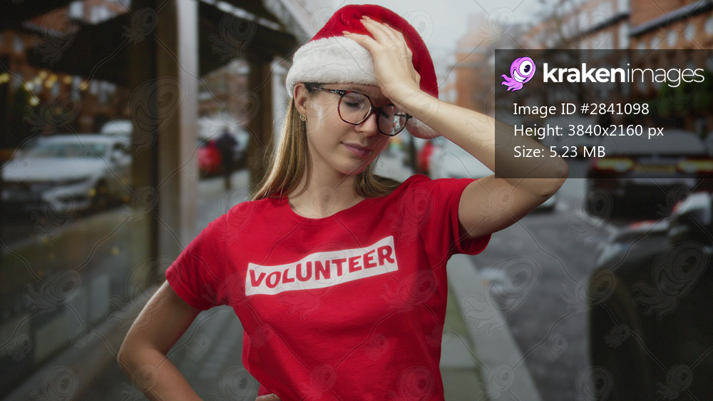 Young blonde woman places hand on forehead wearing volunteer shirt and santa hat on urban street; embarrassment.