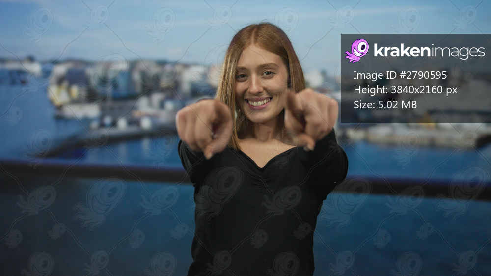 Young blonde woman pointing at the camera with a smile, standing outdoors at a scenic seaside port with boats and a cityscape in the background on a sunny day. - Kraken Images