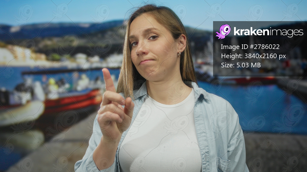 Young blonde woman pointing finger at camera at port; warning alert seriousness attention.