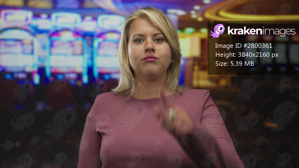 Young blonde woman pointing finger at slot machine in casino indoors with stern expression; rejection.