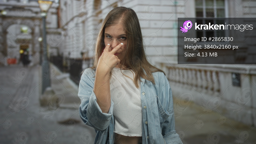 Young blonde woman pointing finger with raised hand and serious expression on street by ornate building; confidence.