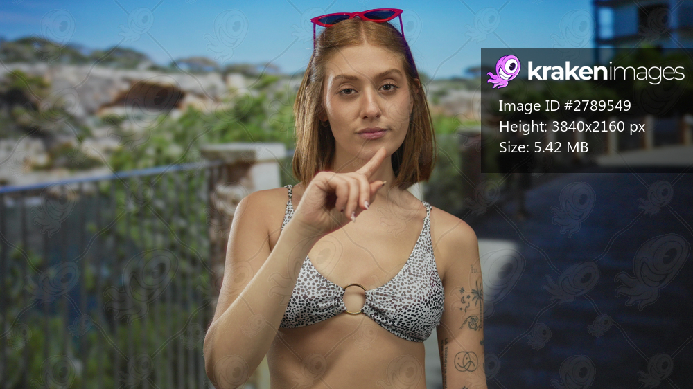 Young blonde woman pointing finger to camera with bare arms in park walkway; focus attention vigilance.