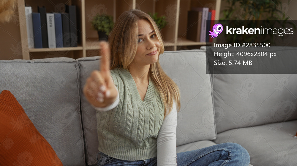 Young blonde woman pointing forefinger toward viewer while seated on sofa in living room; urgent warning.