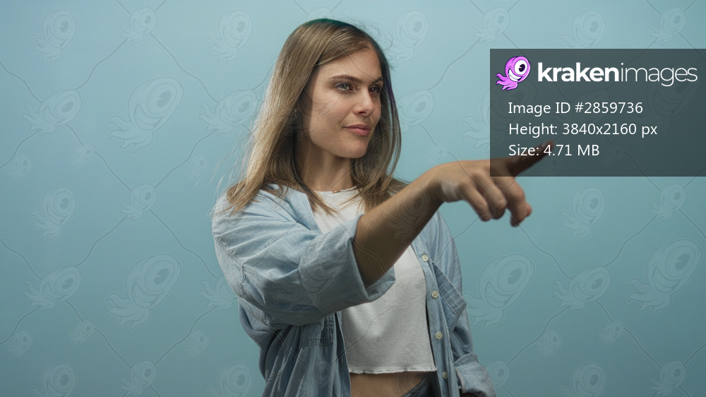 Young blonde woman pointing index finger toward viewer in studio setting with a considered posture; determination.