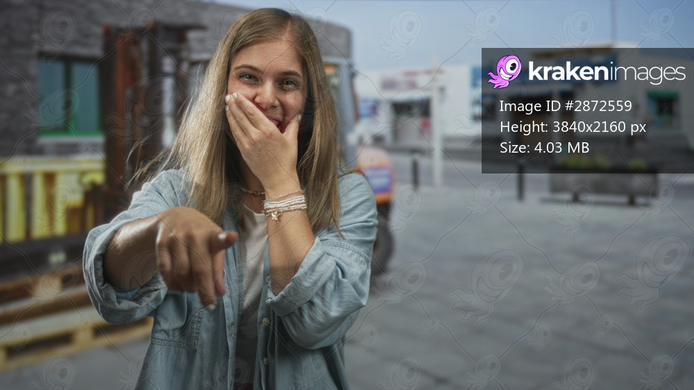 Young blonde woman points finger to camera while covering mouth in laughter on urban street; amusement.