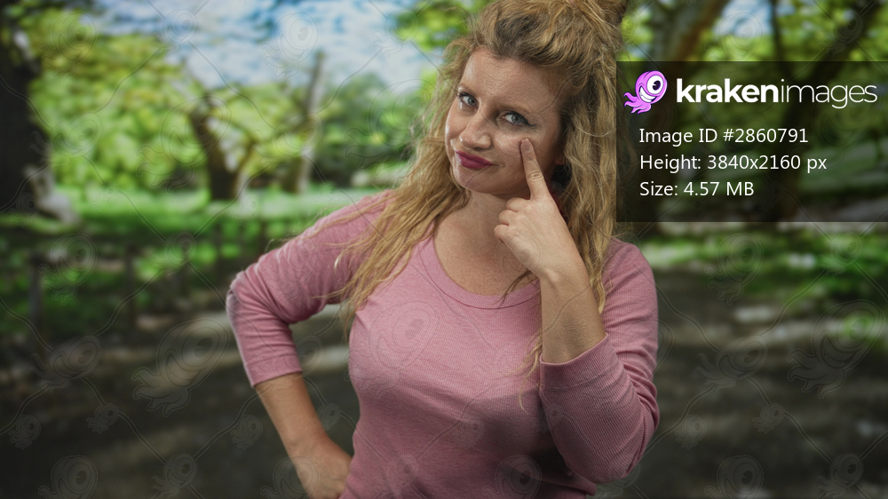 Young blonde woman points finger to cheek while standing on a forest path wearing pink shirt near green park bench; skepticism concern.