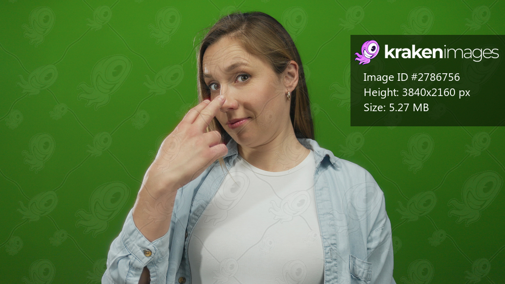 Young blonde woman points finger to eye in film studio; vigilance focus attentiveness alertness.