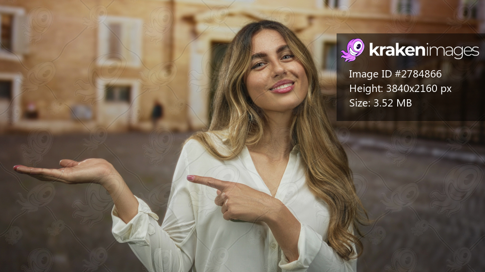 Young blonde woman points finger to palm in historic plaza; friendly offer invitation welcome.
