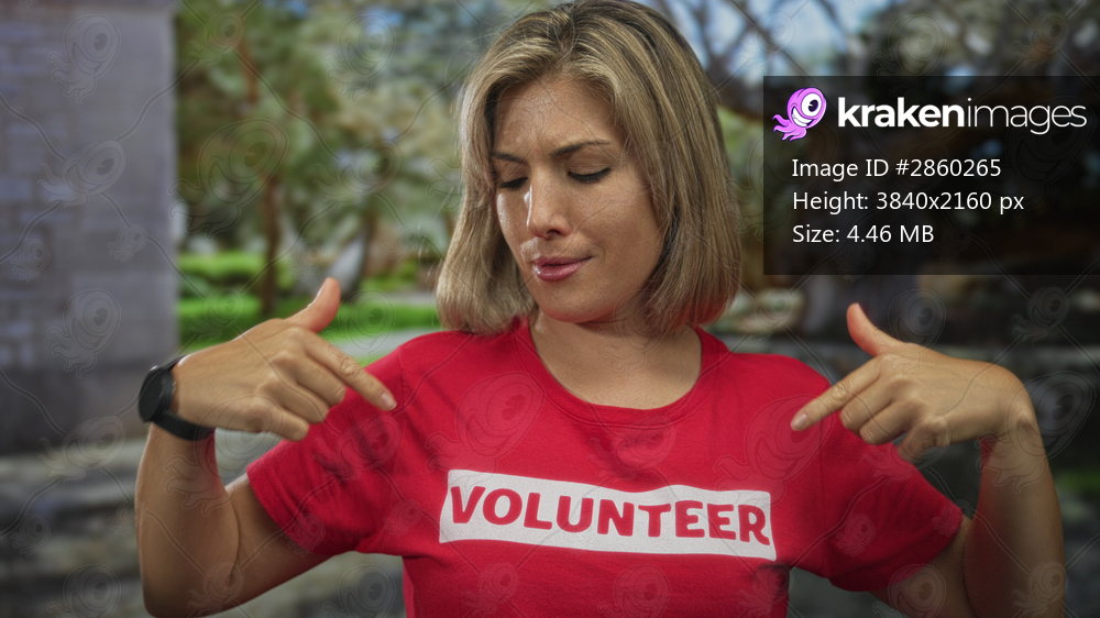 Young blonde woman points finger to red volunteer shirt while standing in forest; community service enthusiasm.