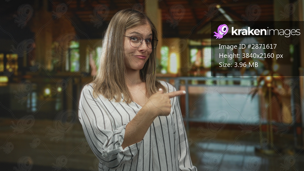 Young blonde woman points finger to side in building lobby wearing striped blouse and glasses, visible forefinger gesture; playful teasing.