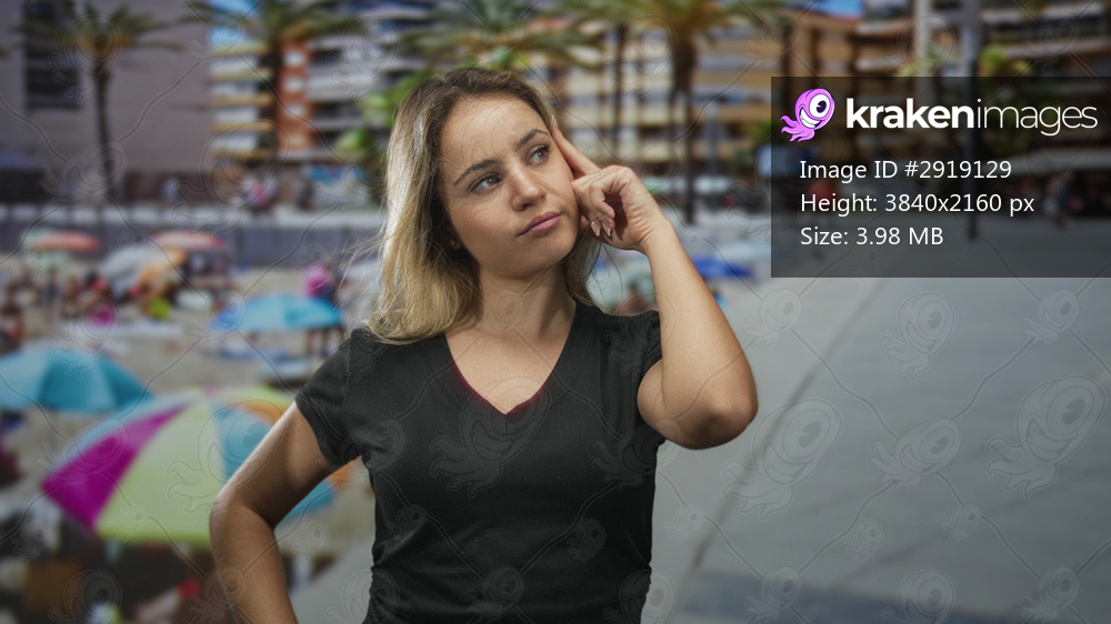 Young blonde woman points finger to temple while standing near a beachfront building in a vneck tshirt with hand on hip; thoughtful curiosity.