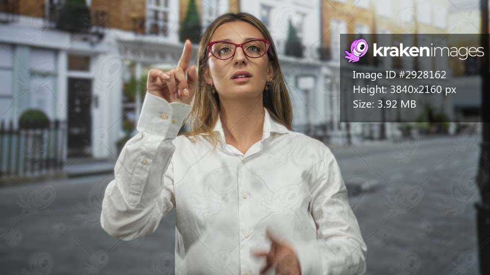 Young blonde woman points finger upward on street while wearing red glasses and white shirt; determination.