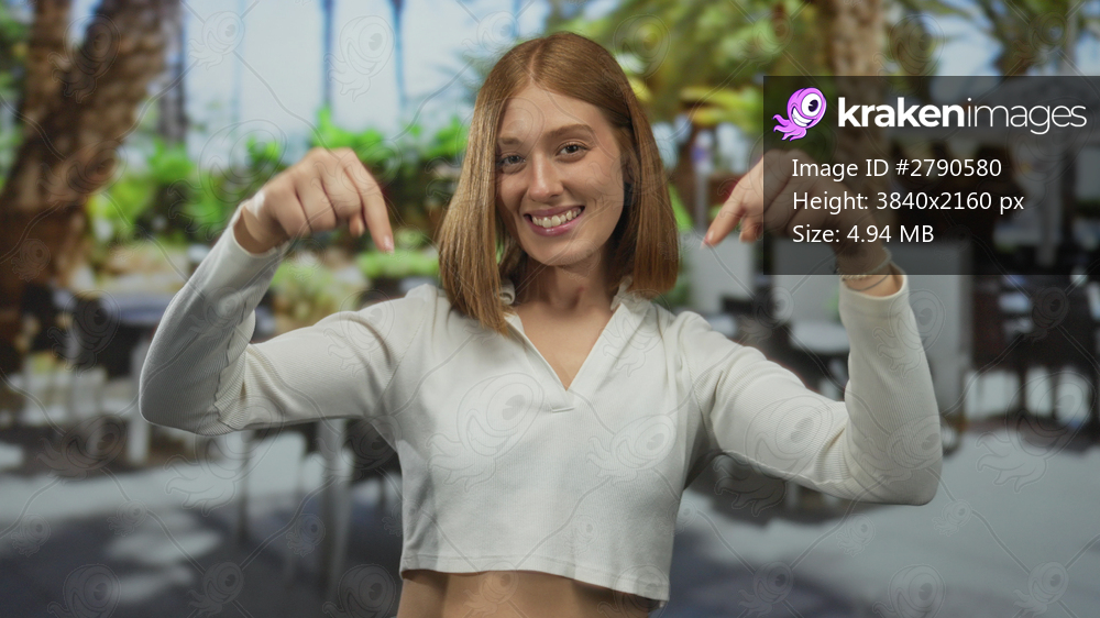 Young blonde woman points fingers downward at menu table on sunlit outdoor cafe terrace; invitation engagement focus attention.