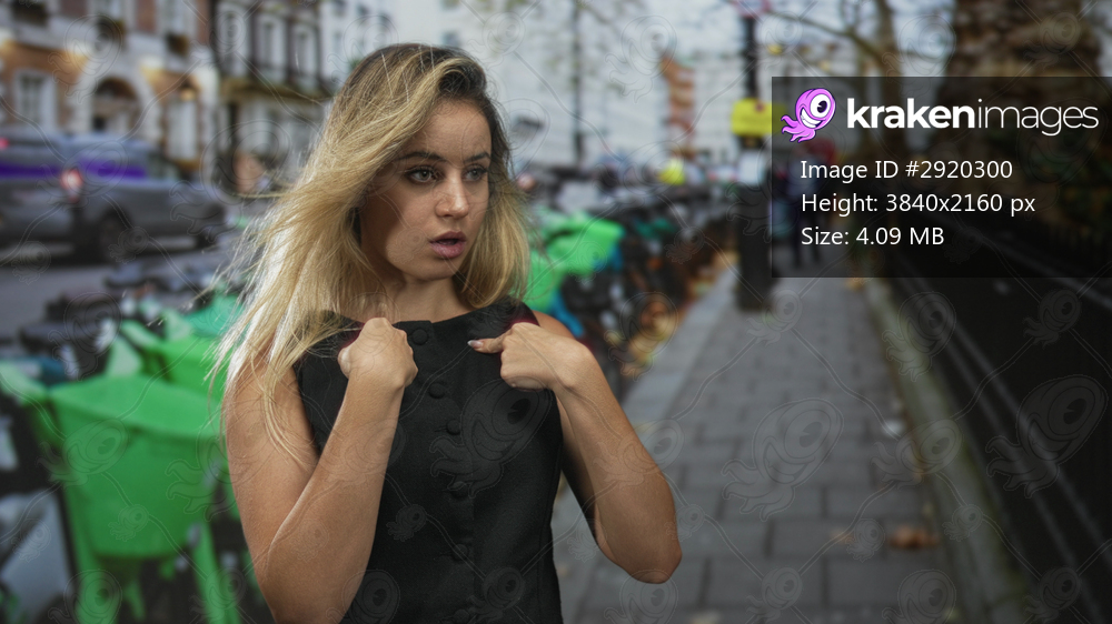 Young blonde woman points thumbs to chest at street bike parking near green rental scooters; surprise curiosity.