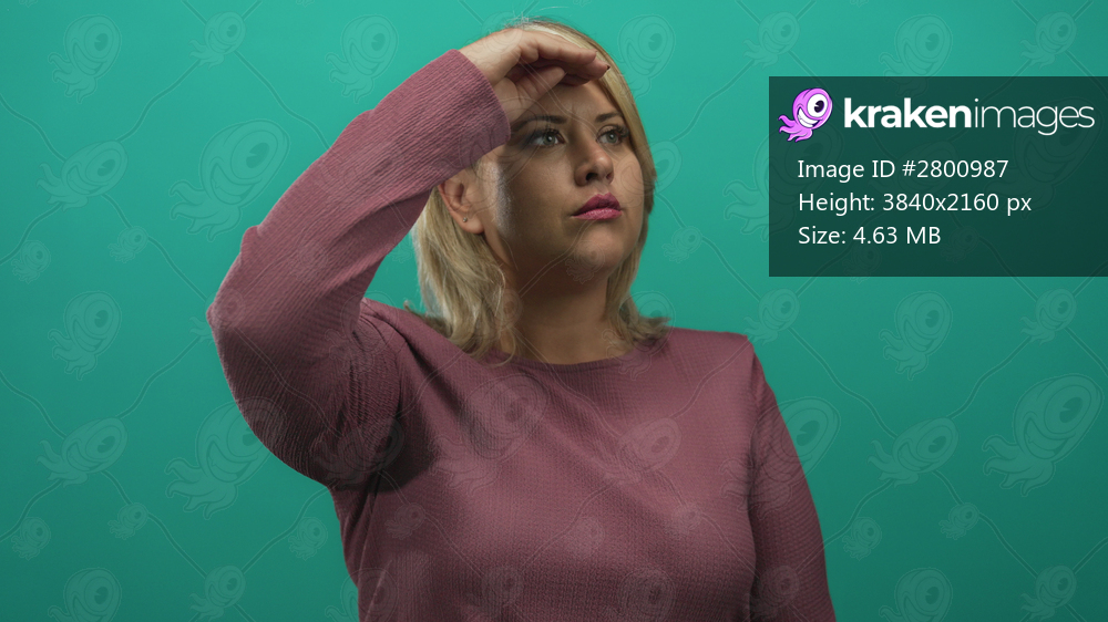 Young blonde woman poses shading eyes with hand against a teal studio wall; curiosity wonder anticipation exploration.