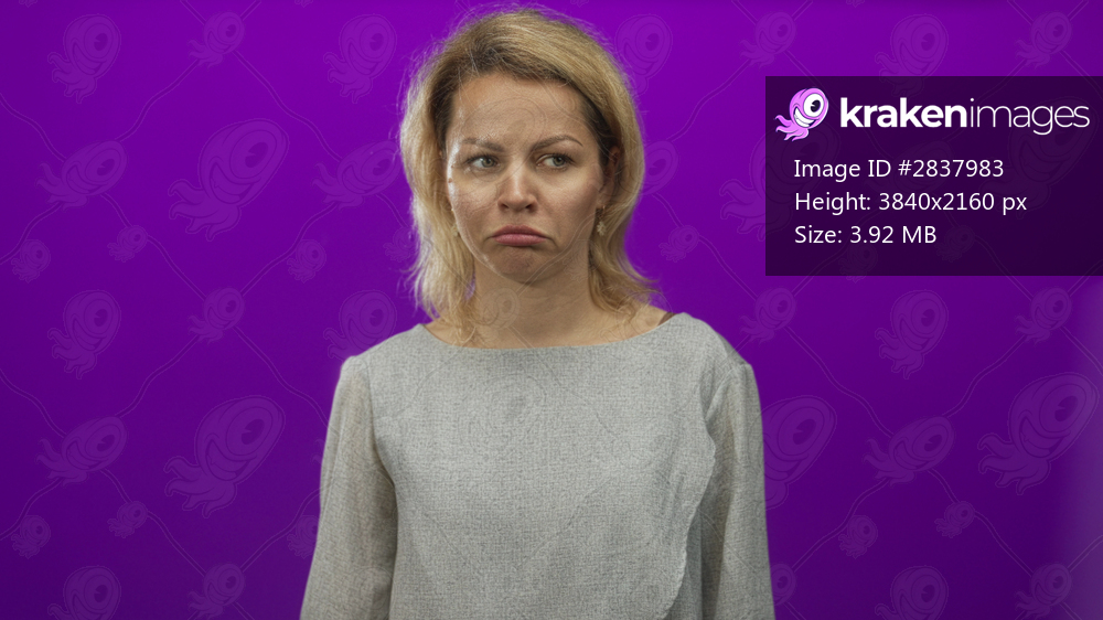 Young blonde woman pouting lips in purple studio setting wearing gray blouse, facing camera with a sullen expression; disappointment.