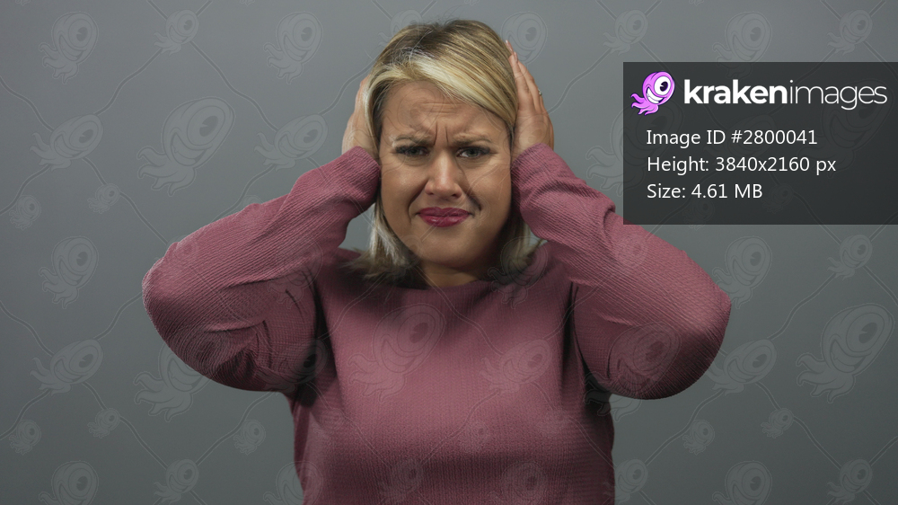 Young blonde woman pressing hands against ears and grimacing in a grey studio setting; discomfort.