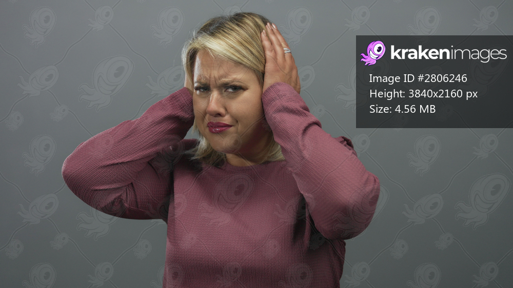 Young blonde woman pressing hands against ears and grimacing in a grey studio setting; discomfort.