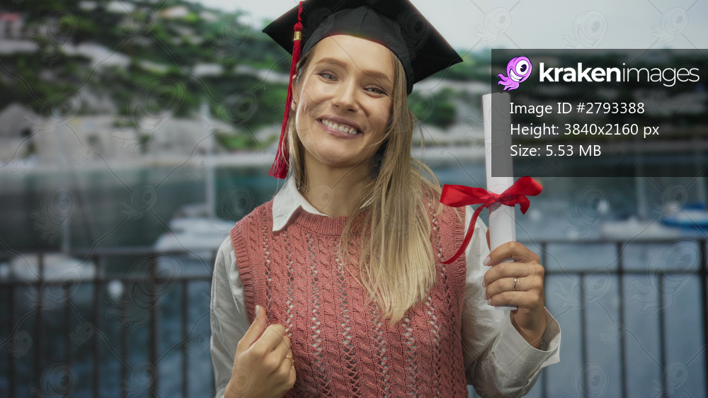 Young blonde woman proudly holding diploma at seaside port, wearing graduation cap and smiling, celebrating achievement outdoors near boats and sea.