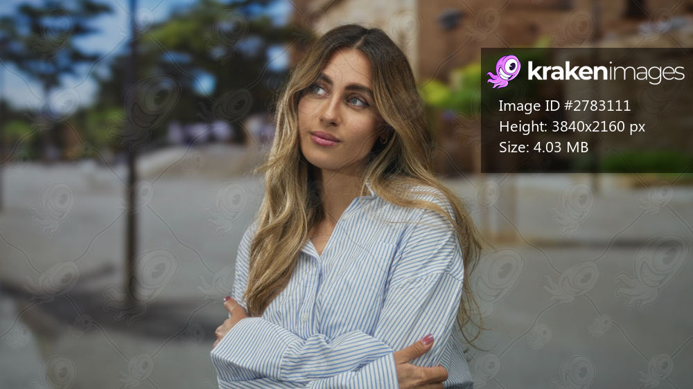 Young blonde woman quietly crosses arms in plaza by stone wall; rejection, doubt, skepticism, defiance.