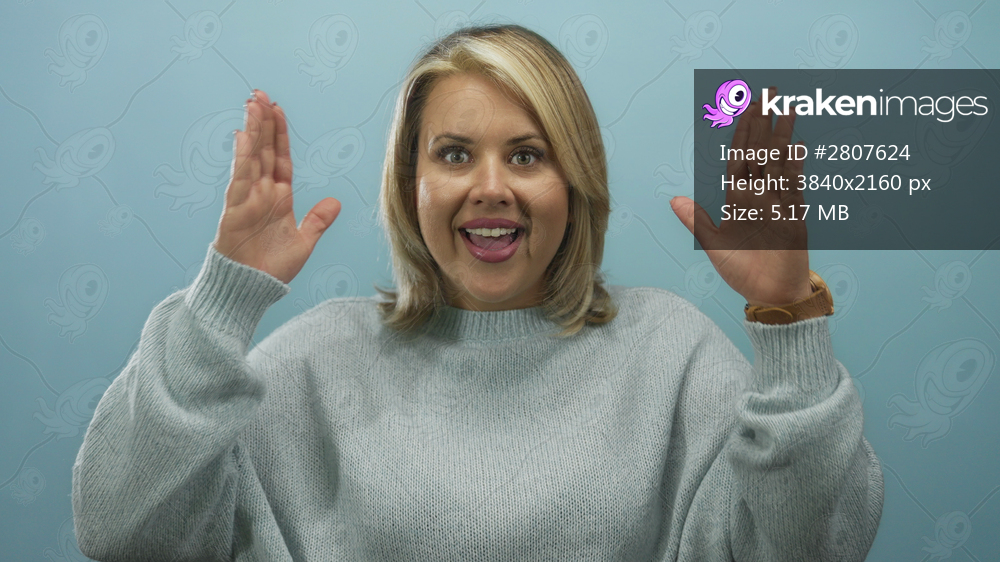 Young blonde woman raises both hands with palms forward against light blue studio wall; expression joy.