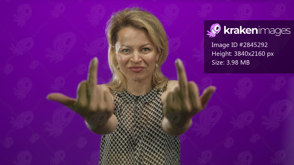 Young blonde woman raises extended bare arms and shows both middle fingers in vivid purple studio; anger.