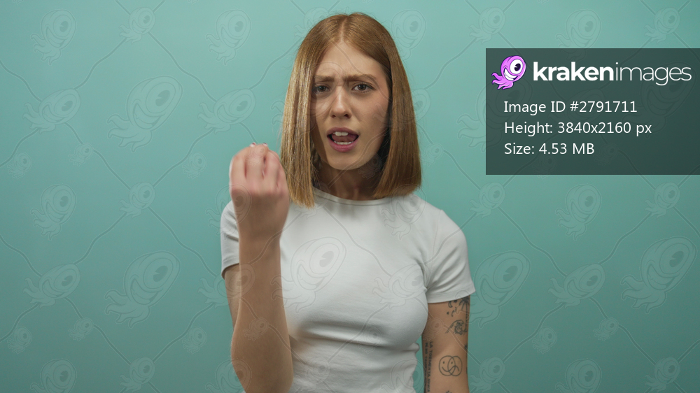 Young blonde woman raises hand in a beckoning gesture in a blue walled photo studio; anger annoyance frustration confrontation.