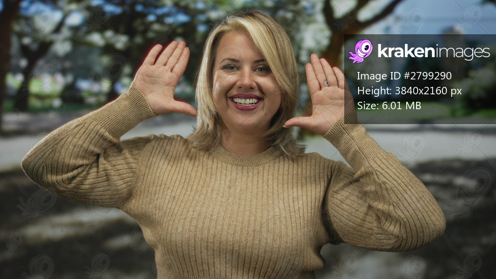 Young blonde woman raises hands with open palms framing her smiling face in sunlit green park; joy celebration.