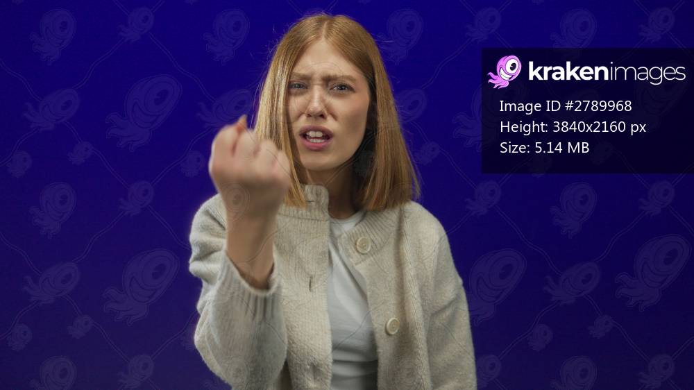 Young blonde woman raising clenched fist in studio; anger frustration defiance determination.