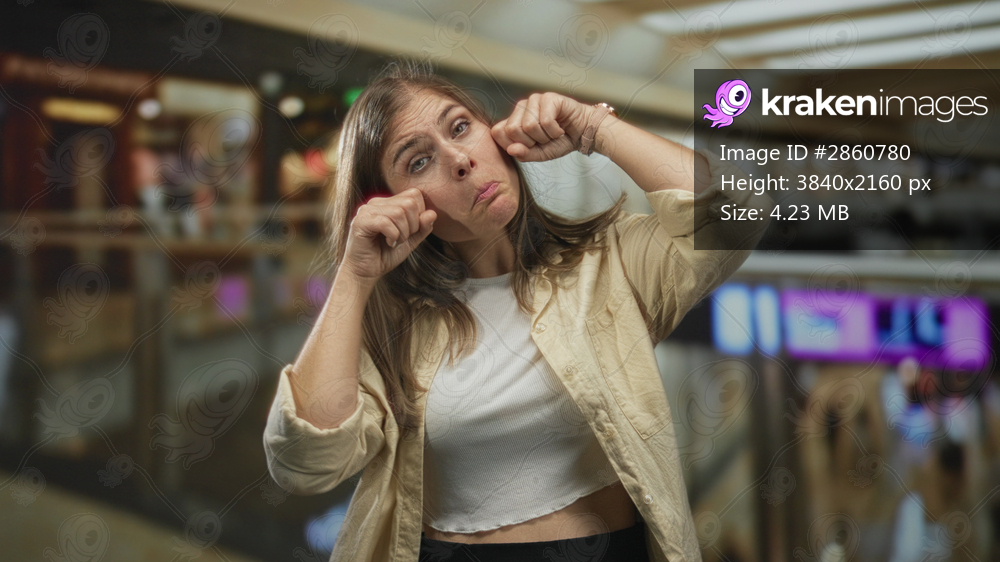 Young blonde woman raising clenched fists near cheeks in a bright busy shopping mall building; playfulness.