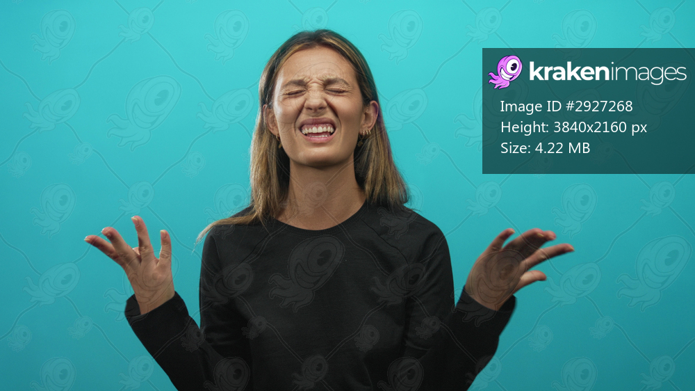 Young blonde woman raising hands in a shrug gesture, squinting and looking up in turquoise studio; frustration moment.