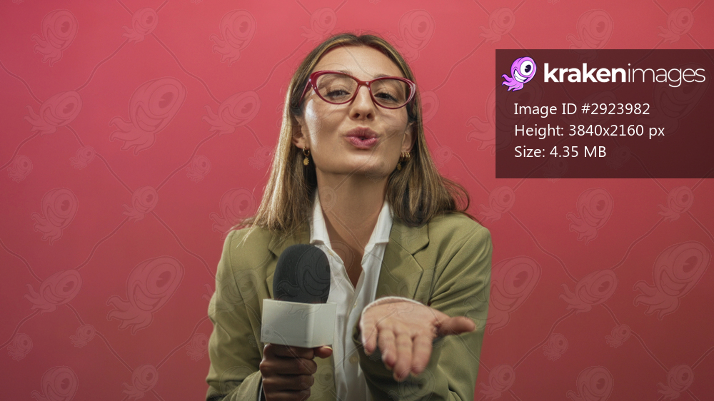 Young blonde woman reporter holding microphone blows kiss with hand toward camera in pink studio; affection gesture.