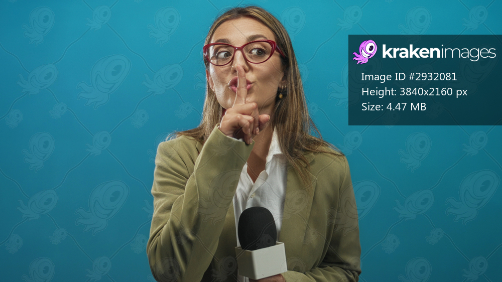 Young blonde woman reporter holding microphone with finger to lips for silence in blue studio; secretive hush quietness.